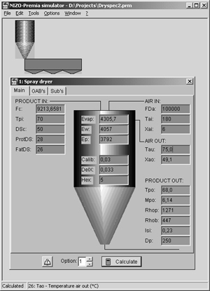 The first drying model that was developed by NIZO food research is DrySPEX2(Dryer system for property and Energy Control).This computer model describes the relations of the drying process ,energy consumption and the properties of the powder produced for a two-stage dryer . The purpose of this model is to establish the process conditions that ensure optimal exploitation of the capabilities of exiting drying installations with regard to energy consumption and the powder properties .This model assumes a near-equilibrium state of water vapour pressure between powder and outlet air which eliminates the need for a detailed description of heat and mass transfer phenomena during the driving process .In Figure 1 a screenshot of DrySPEC2 is shown .The model is integrated in a user-friendly interface in which other software modules can also be accessed.