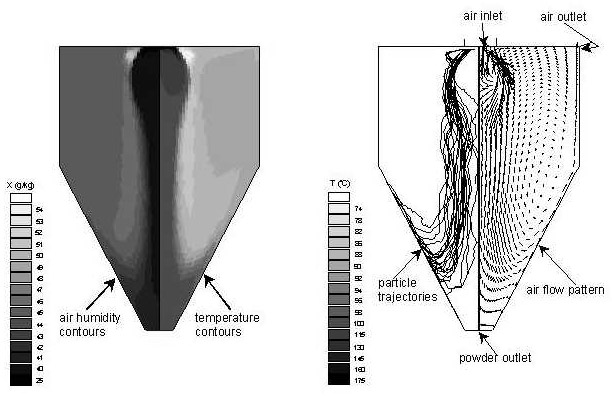 Figure 4.Computational simulation (NIZO Dry-Sim) of an industrial spray dryer . Initial droplet velocity:15m.s1:(a)air humidity and temperature contours; (b)simulated air-flow patterns and particle trajectories.