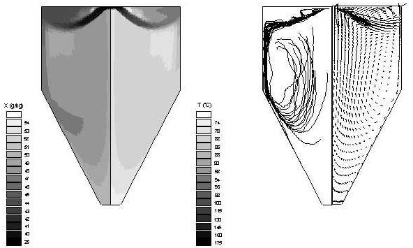 Figure3.Computational(NIZO Dry-Sim) of an industrual spray dryer. Initial droplet velocity :58 m.s:(a) air humidity and temperature contours ; (b)simulated air-flow patterns and particle trajectories.