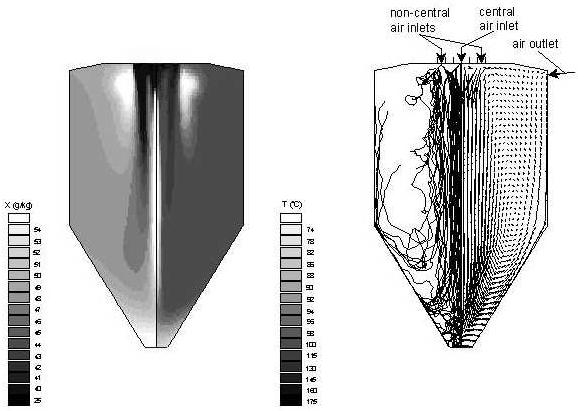 Figure 5. Computational simulation of an industrial spray dryer:air humidity and temperature contours; (b) simulated air-flow patterns and particle trajectories.