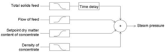 An indutrial case is the desig and implementation of a feed -forward control system for a four -stage falling film evaporator with thermal vapour recompression .This control system contains a feed-forward compensation for the dry matter cotent of the feed to the evaporator (e.g.by measuring the density of milk using an in-line sensor), a feed-forward compensation for floe tp the evaporator and a feed-back control system using the measure desity (in-line sensor)of the concentrate ,The dry matter content of the steam supply to the ecaporator . In Figure 8 a schematic presentation of this feed-forward control system is given ,illustrating how a variation in input (dry matter content of the oncentrate) or set-point of the dry matter contnt of the concentrate will affect the steam supply to evaporator .Based on step-response measurement,the specific control algorithm is designed and implemented in the existing programmable logic controller(PLC) of the evaporator.